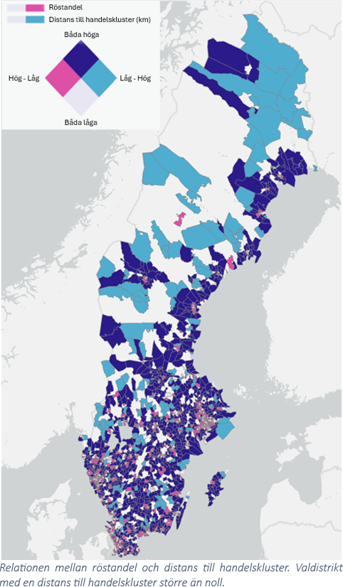 För analysen har valdeltagandet i riksdagsvalet 2022 använts. Genom att extrahera koordinater för valdistrikten samt för SCB-definierade handelskluster kan avståndet mellan dessa beräknas. Valdistrikten samt handelsklustrens mittpunkt har använts för avståndsberäkningen. För analysen används en multipel regressionsanalys med röstandel som utfallsvariabel. Kontrollvariablerna är; andel högutbildade, andel med utländsk bakgrund, andel höginkomsttagare och befolkningstätheten i ett valdistrikt. Alla variabler beräknas som andel av de röstberättigade, till exempel andelen röstberättigade med hög utbildning dividerat med totalt antal röstberättigande i ett valdistrikt. Alla valdistrikt som har ett handelskluster eller gränsar till ett, och där distansen har uppmätts till noll, har exkluderats. Inkluderas dessa blir handelns effekt på valdeltagandet något högre.