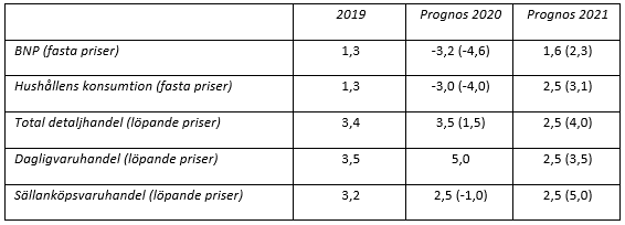 Ekonomin och mänskligheten har utsatts för enorma prövningar under 2020 i och med coronapandemins globala skadeverkningar. Efter den inledande chocken inleddes en kraftfull återhämtning under sommarmånaderna – inte minst genom en urstark detaljhandelssektor. HUI Research reviderar upp BNP-prognosen för 2020, från -4,6 till -3,2 procent. Återhämtningen är snabb men skör, då risken för nya smittkluster, finansiella obalanser och den extraordinära arbetsmarknadssituationen måste vägas in.